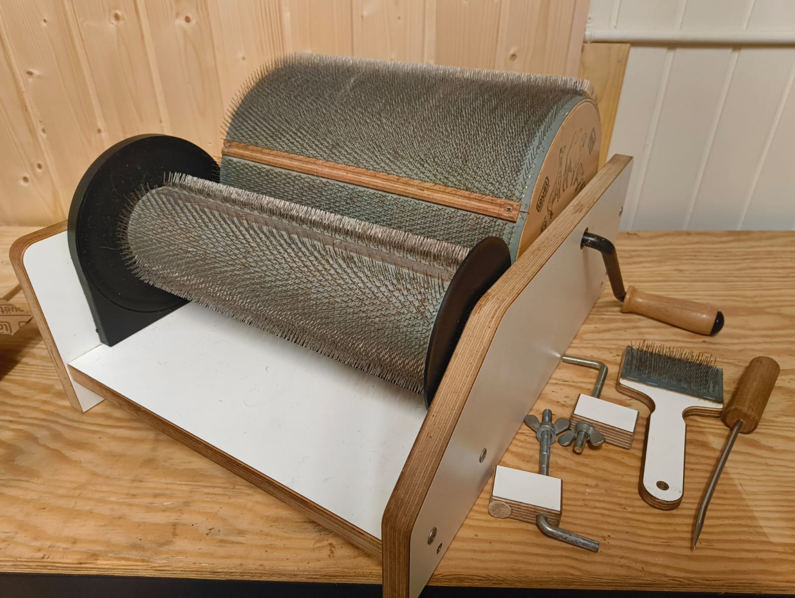 Wil je graag wol kaarden, maar heb je geen kaardmolen in huis. Deze kaardmolen XL 72 tpi. is geschikt voor fijne vezel, zowel van alpaca als schapenwol.  Door de grote walsbreedte van wel 30 cm kun je een grote hoeveelheid kaarden, van wel 120 gram per vlies. De brede wals is ook gemakkelijk bij het mengen van kleuren. De kaardmolen wordt geleverd met een handleiding, schoonmaakborstel, afhaalpen en tafelklemmen. Zo kunt u meteen aan de slag.